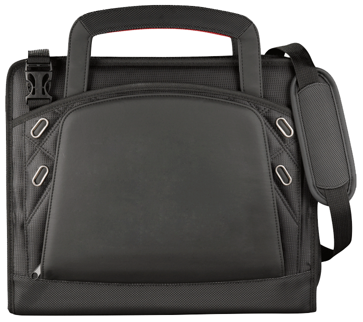 Item Information : 12.5 "x 14.63" x 2.75" dobby nylon padfolio with a zippered closure. TechTrap elastic inside organizer holds an iPad securely. Front cover access pocket with business card holders and media organizers. Has four USB memory flash drive holders, two card holders and elastic pen loop. Removable 1.25" three ring binder. Includes an 8.5" x 11" writing pad. Gusseted document pockets. Hideaway handles. An adjustable and detachable shoulder strap.